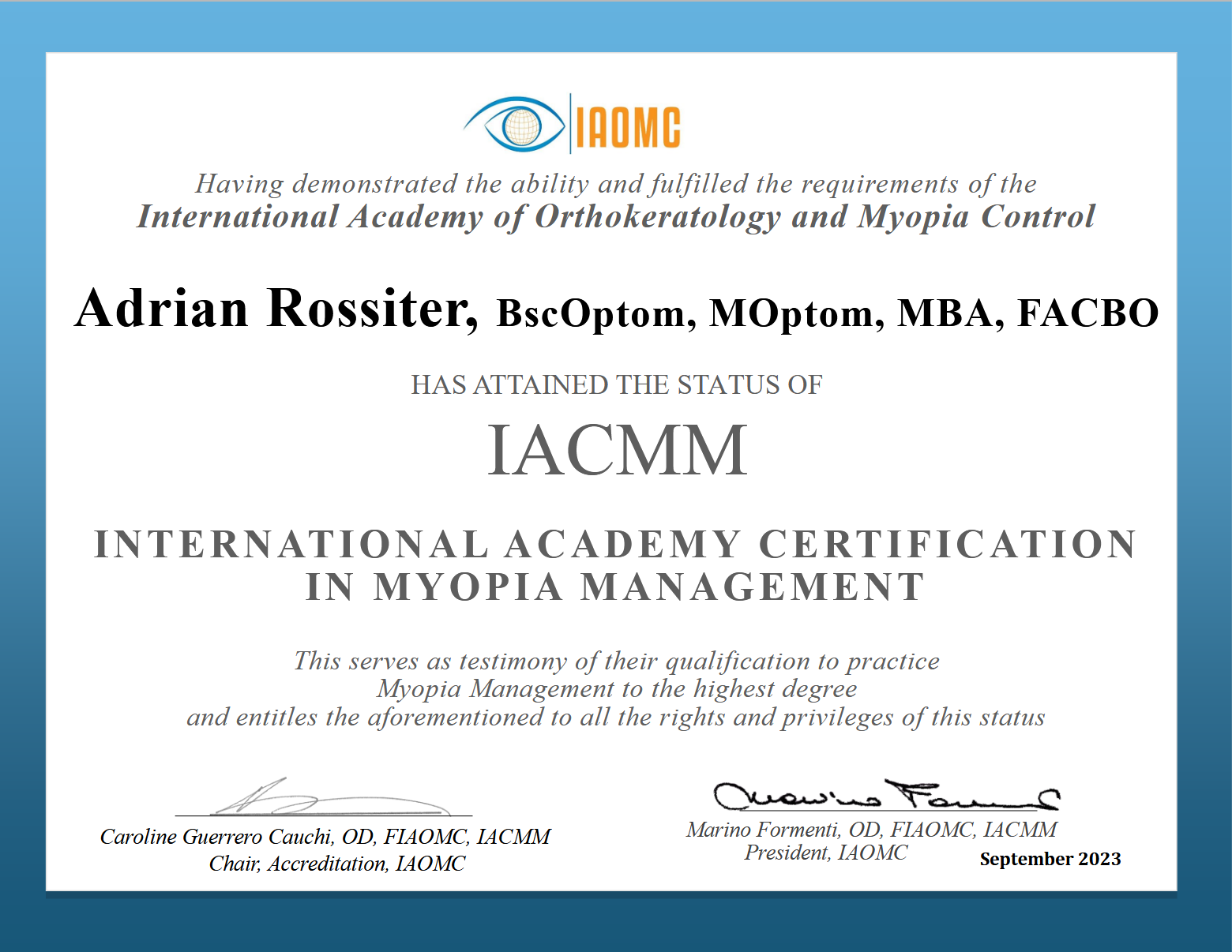 In addition, they may have obtained additional qualifications such as IACMM which stands for The International Academy Certification in Myopia Management. This is an advanced accreditation offered by the International Academy of Orthokeratology & Myopia control (IAOMC) to individuals who have completed a comprehensive training program in myopia management and orthokeratology.